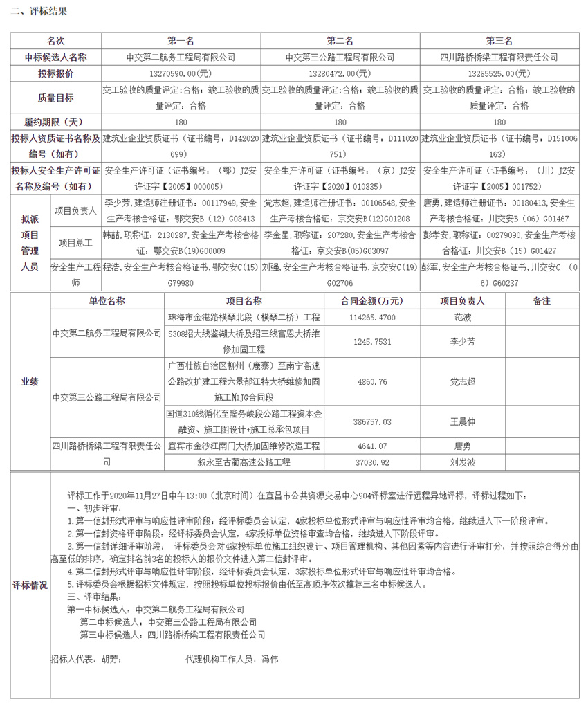 標段(包)編號:YCGJT0093-202001-01 一、招標概況 宜昌市秭歸縣公路管理局G348九畹溪大橋、龍潭河特大橋維修加固工程于2020年11月3日在宜昌市公共資源交易網發布招標公告,2020年11月27日9時0分在宜昌公共資源交易中心開標、評標 ,根據評標委員會提交的評標報告,現將中標候選人公示如下: 二、評標結果