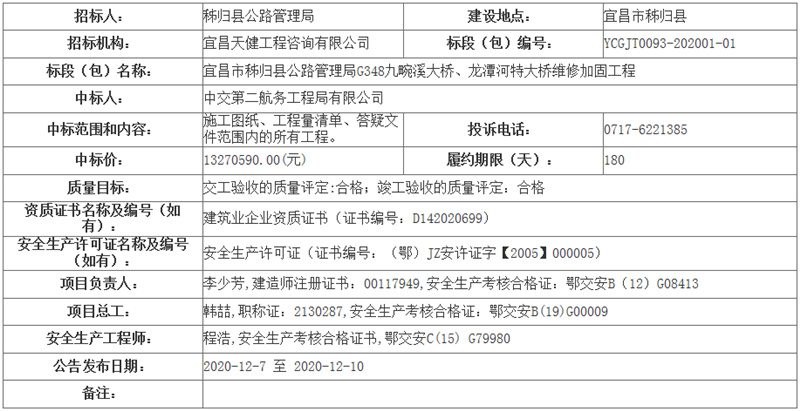 宜昌市秭歸縣公路管理局G348九畹溪大橋、龍?zhí)逗犹卮髽蚓S修加固工程中標結果公告 |
