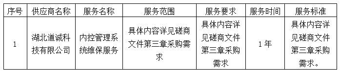 一、項目編號:YCTJ-2025009 二、項目名稱:內控管理系統維保服務 三、中標(成交)信息 供應商名稱:湖北道誠科技有限公司 供應商地址:中國(湖北)自貿區宜昌片區發展大道57-5號503 投標報價:165000.00元 四、主要標的信息